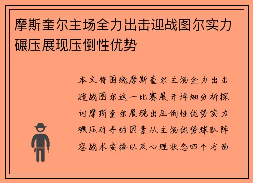 本文将围绕摩斯奎尔主场全力出击迎战图尔这...