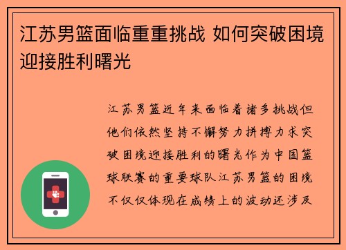 江苏男篮近年来面临着诸多挑战,但他们依然...