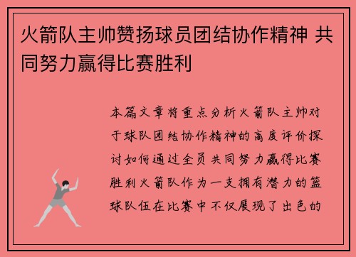 本篇文章将重点分析火箭队主帅对于球队团结...