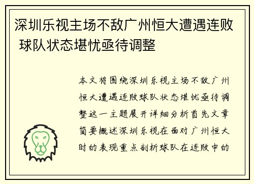 本文将围绕“深圳乐视主场不敌广州恒大遭遇...