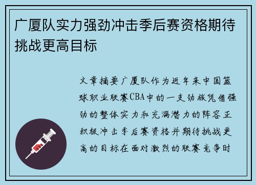 文章摘要:广厦队作为近年来中国篮球职业联...